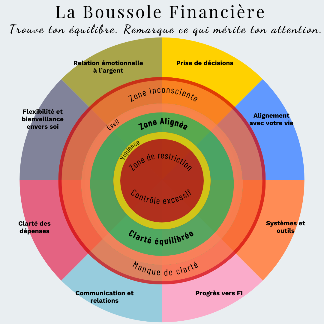 Cet outil vous aide à prendre une pause consciente. La Boussole vous invite à réfléchir avec douceur à 8 aspects de votre relation à l’argent, pour initier un cheminement plus équilibré.
